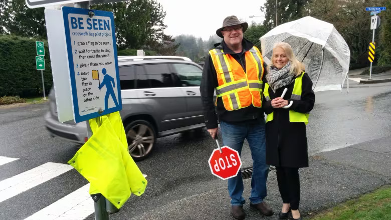 A photo of a pedestrian flag crossing set up on a West Vancouver crosswalk. Photo source: CBC News