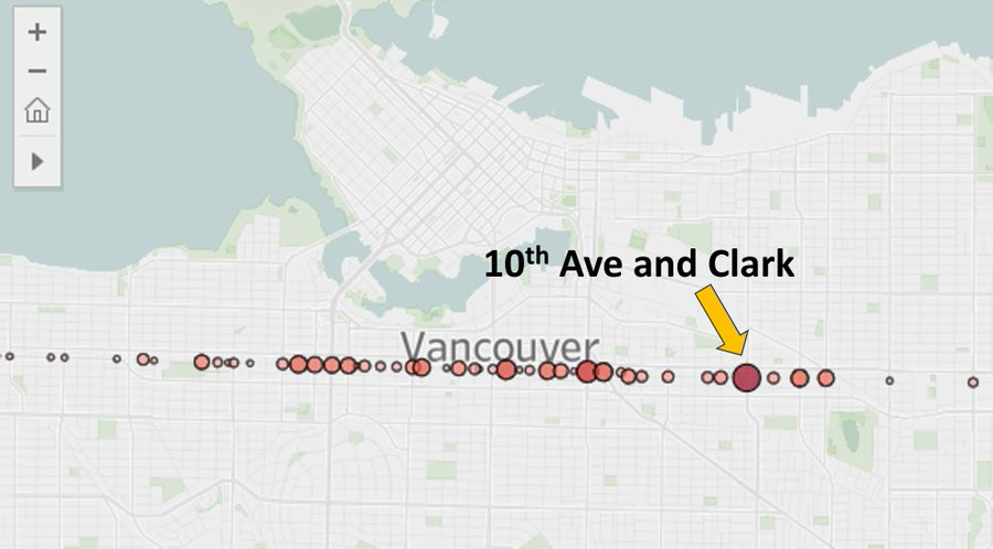 This crash happened at 11th and Clark, 2 blocks south of Broadway. And don’t say 10th is better. See the map of ICBC-reported cyclist collisions below. 10th is the worst street in the entire city.