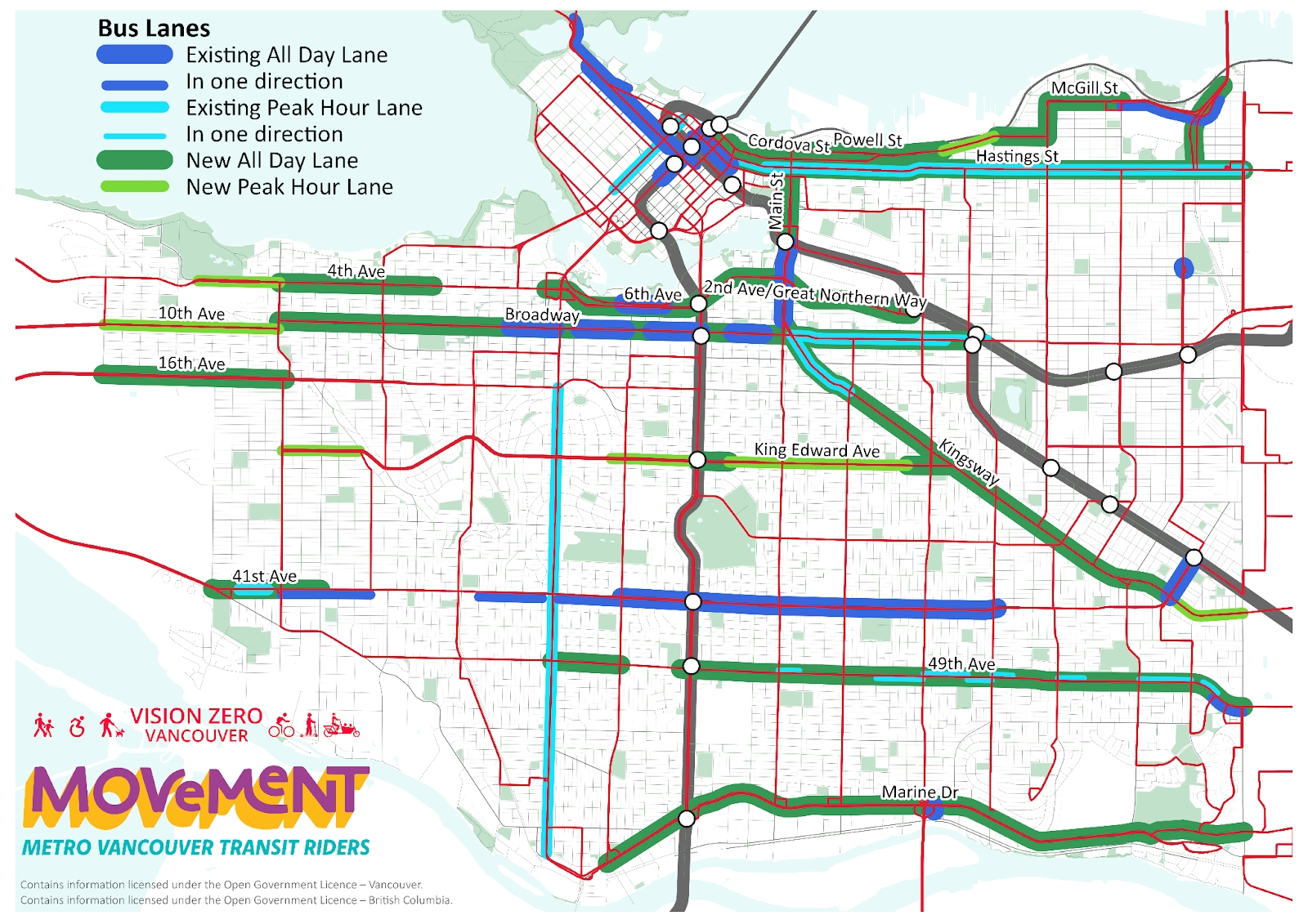 The motion, brought forward by Councilor Christine Boyle, builds off the excellent motion spearheaded by Councilor Sarah Kirby-Yung last year, which committed to speed and priority improvements on 5 routes (Kingsway, 49th, Marine, Granville, and Hastings). Today’s motion ensures that these 5 routes will be further strengthened with extensive bus lanes, and adds 4 additional corridors (King Edward, West 4th, Broadway, and Powell/Cordova), in alignment with TransLink’s urgent priorities. Work on the first 5 routes will be implemented by 2026, and the other 4 shortly thereafter!