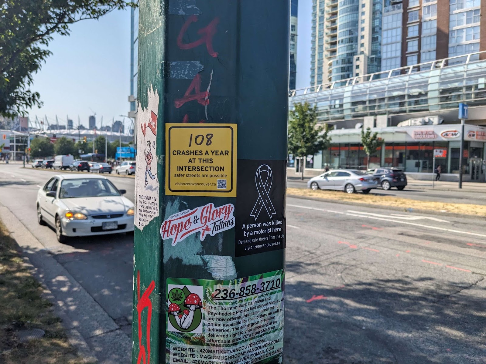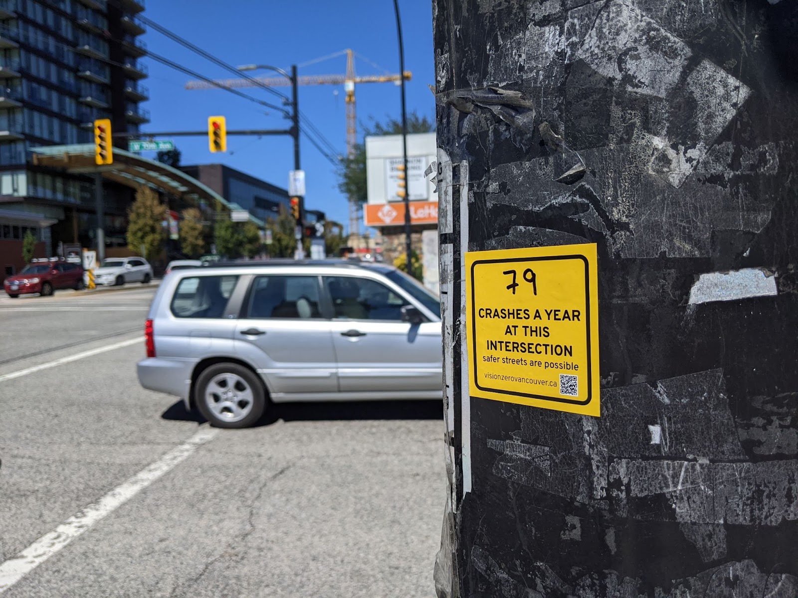 So why do we put up these stickers? The point we aim to convey is that crashes aren’t rare. They aren’t flukes or acts of God. They’re not caused by a small handful of bad drivers. They are extremely prevalent, they happen by the dozens at almost every intersection in the city, and they’re the result of a systemic problem: our roads are designed for rapid vehicle throughput first, and human life second. We hope that once that message sinks in, people will be more inspired to act.