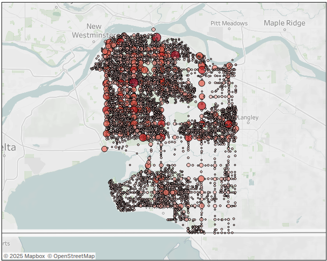 ICBC has a really good statistics page that publishes annual data. They give numbers on total crashes, crashes involving injury, primary causes of collisions, and crashes involving cyclists or pedestrians. And, they provide maps. Here’s a map of all crashes in Vancouver from 2019-2024.