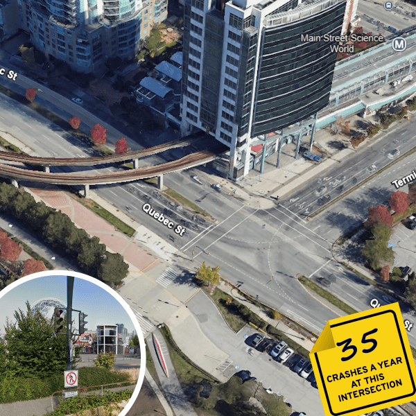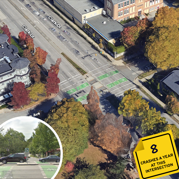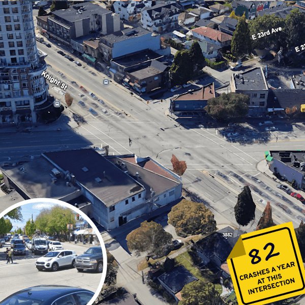 - Knight St & East 41st Ave: What do you get when you cross one of the city’s only 24-hour restaurants, one of South Van’s only bars and the intersection of two seven-lane roads full of trucks? 96 yearly crashes, apparently.