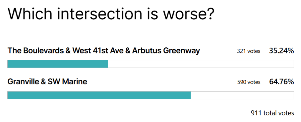 - Granville St & SW Marine Dr: Two bridges, a high-speed interchange, terrible pedestrian infrastructure, a weird bus exchange underneath a highway, and a six-block gap between the Arbutus Greenway and Kent Avenue Bikeway. What could go wrong?