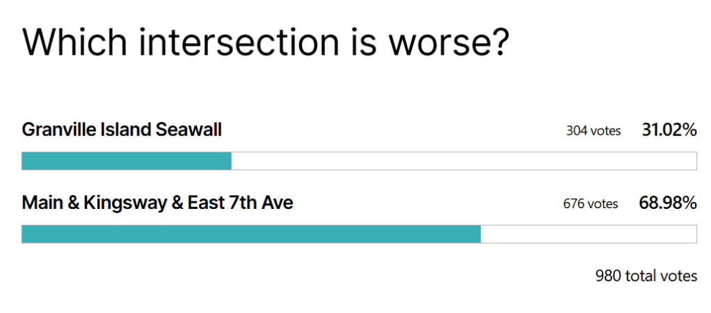 - Main St & Kingsway & East 7th Ave: Vancouver’s infamous triangle intersection, delaying buses, confusing drivers, detouring cyclists and befuddling pedestrians since its creation.