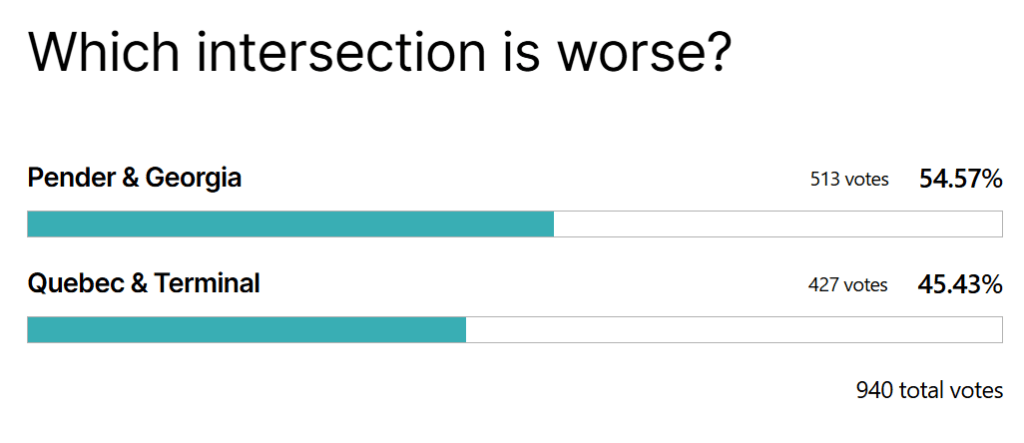 - Quebec St & Terminal Ave: Does it make sense that you can’t cross the south side of this intersection because of an abandoned streetcar stop that hasn’t seen a single passenger since the Olympics? No but we’re going to do that anyways.