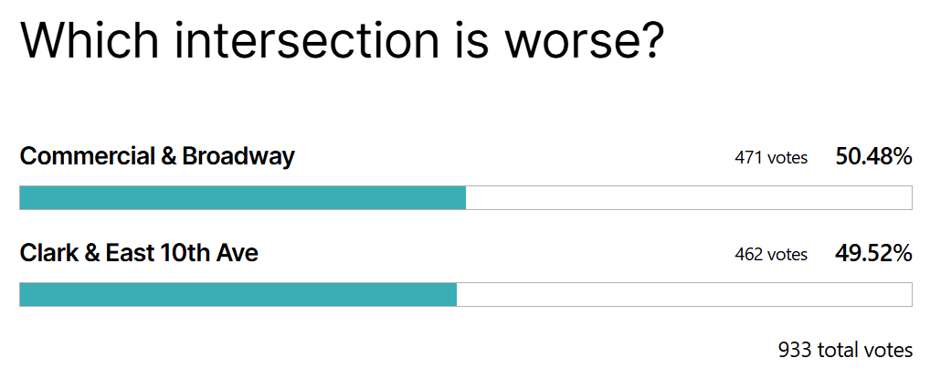 - Nanaimo St & E Broadway: Come for the $2.95 breakfast at Bon’s. Stay because you got hit by a car trying to cross seven lanes of Broadway at a diagonal angle.