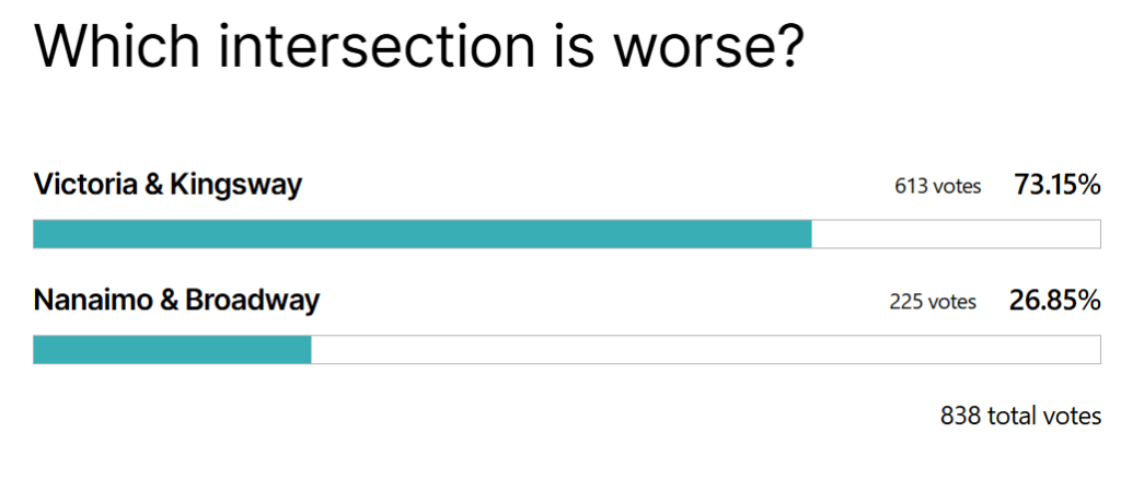 - Victoria Dr & Kingsway: Almost every intersection with Kingsway is terrible, but two drive-thrus and a gas station turn the pedestrian experience at Victoria into a real-life game of Frogger.