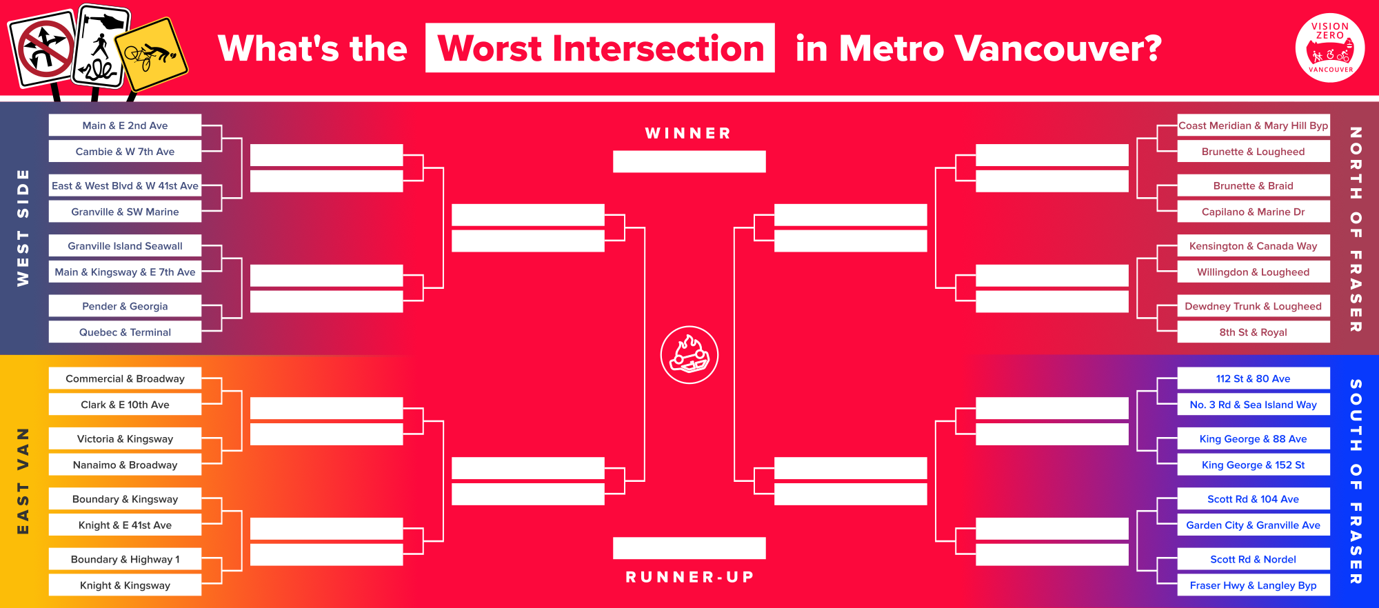 In doing so, we aim not only to crown a Grand Winner (Loser?), but also to highlight the reality that safety often comes last when our governments design roads. Each year, 100 people are killed on our roads in Metro Vancouver. Together, we can advocate for safer road designs to bring that number down to zero. Join us in our fight to make that a reality!