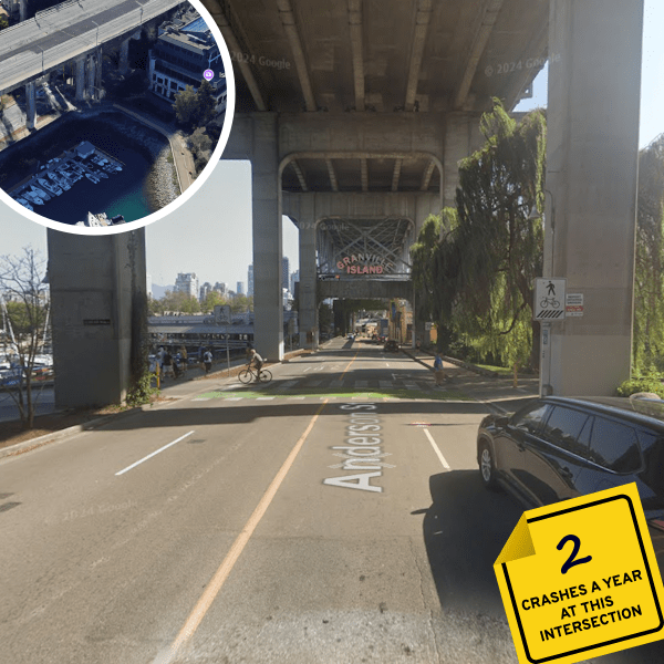 - Granville Island Seawall (Anderson St): Home to our famous brick video, pedestrians and cyclists emerging from a blind spot behind a bridge column have to dodge four lanes of cars to cross a road, with no help except from a bit of paint.