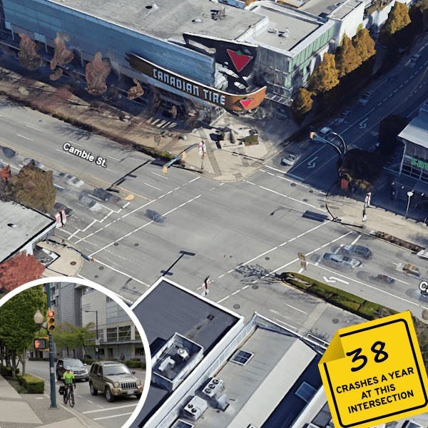 - Cambie St & West 7th Ave: The Off-Broadway bike route that Ken Sim claims is so good we don’t need bike lanes on Broadway meets every right turning car leaving Canadian Tire.