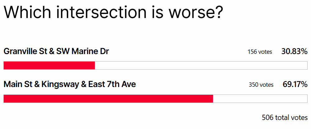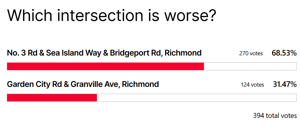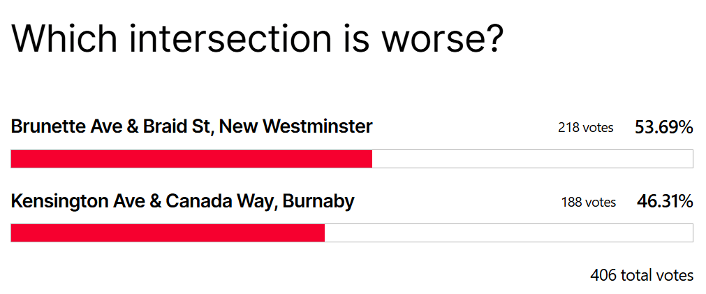 Last round, two suburban stroads that prioritize traffic flow over the safety of anyone trying to cross faced off, with Richmond’s airport approach tangle beating Surrey’s King George & 88 Ave mess 53%–47%. Meanwhile, a second Richmond intersection—Garden City & Granville—squeaked out a victory against the highway diversion in front of Langley’s Willowbrook mall by four votes.