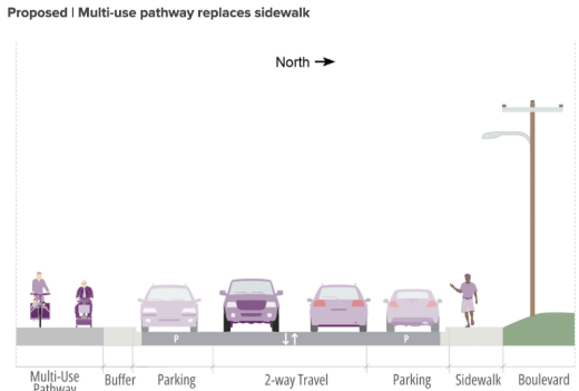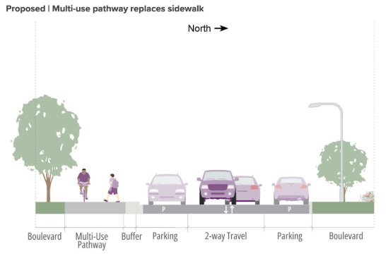 To avoid as much conflict and confusion as possible this proposal should either be a multi-use path the entire way, or bike lanes the entire way. Separated bike lanes could be easily accommodated by removing one parking lane or converting some of these streets to one-way traffic.