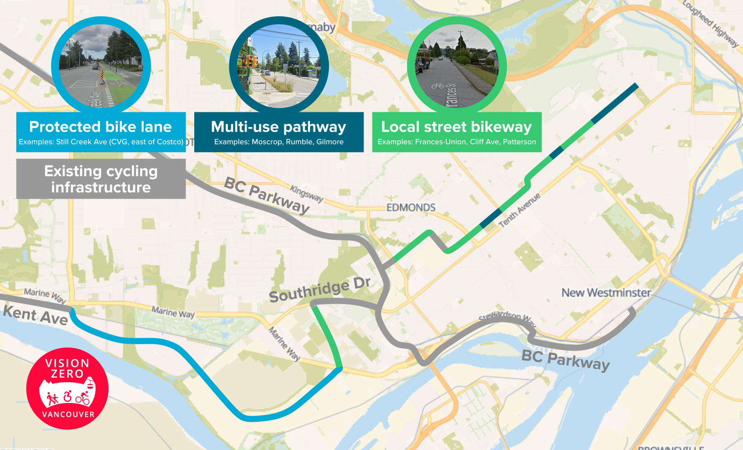 - Instead being broken up, this should be a complete protected bike lane or pathway all the way from Cariboo Heights to Edmonds
