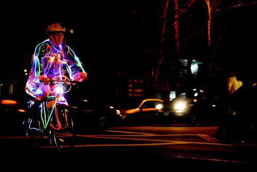 As the seasons change, and the days get shorter, we often get asked, “Why doesn’t Vision Zero promote reflectors and lights for pedestrians and cyclists? It seems like everyone wears dark rain coats and they can’t be seen!”