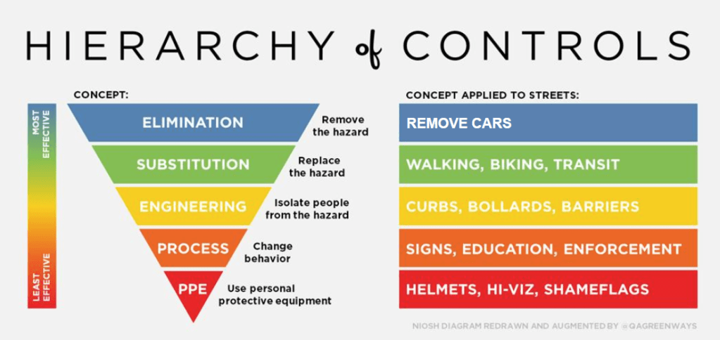 Personal protective equipment is the least effective layer of protection in the hierarchy of controls – by the time you need it, you’re already in danger. A reflector may help you feel safer but will never replace streets designed to prevent deadly errors.