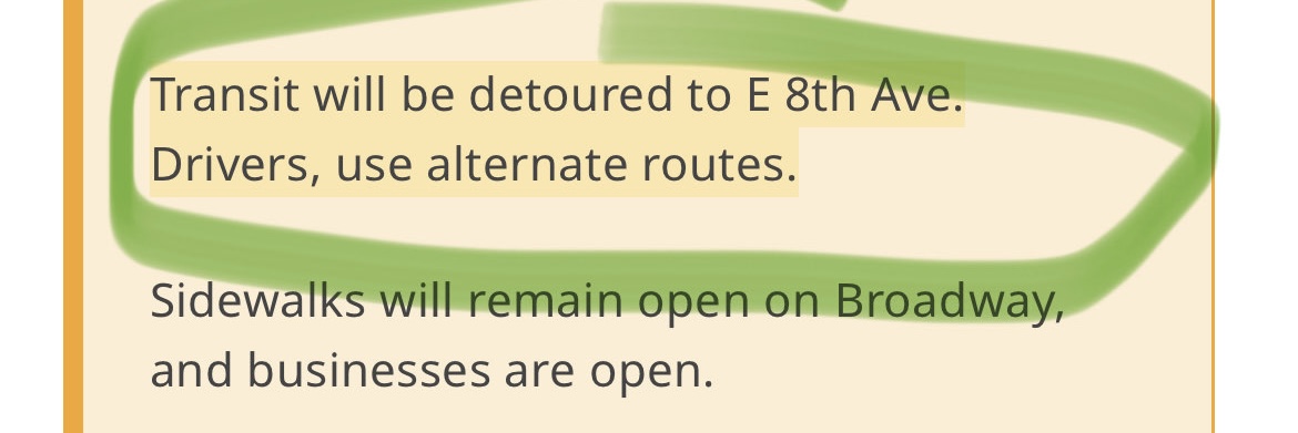 Broadway hosts the busiest bus route in all of the US and Canada, and the parallel 10th Ave is a bustling east-west cycling connection. It was clear from the outset that these modes would need to be thoughtfully considered in the detour – but we weren’t seeing that in the plans. We started sounding the alarm before the closure even began (here’s our volunteer Haakon Koyote speaking with CityNews about the proposal back in early January).