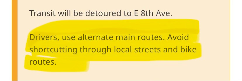 On February 2nd we noticed a language change on the city’s website. After a week of traffic chaos and two people injured in the area, they’d updated to kindly ask drivers to detour on main routes, and avoid the local bike routes. This is great news for everyone who gets their detour directions from the city’s website!