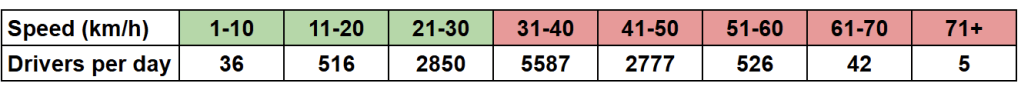 The city collected their own speed data, and it matches what we saw: 72% of drivers drive faster than the 30km/h speed limit, and 27% go more than 10 km/h faster.