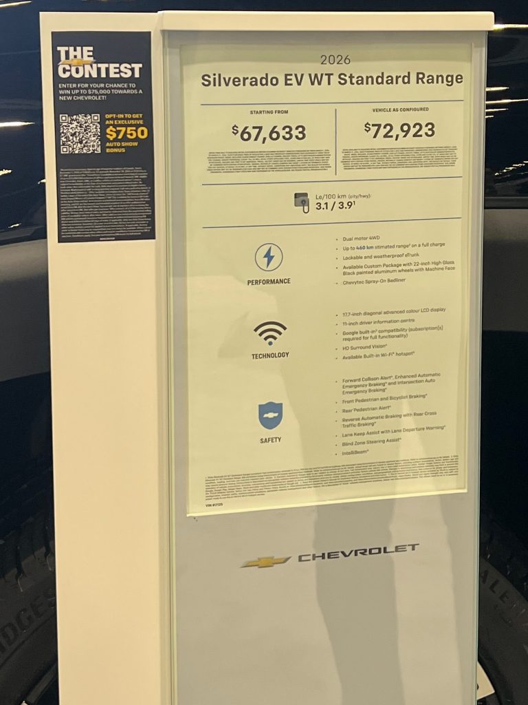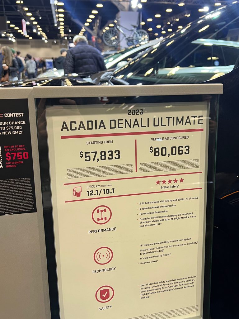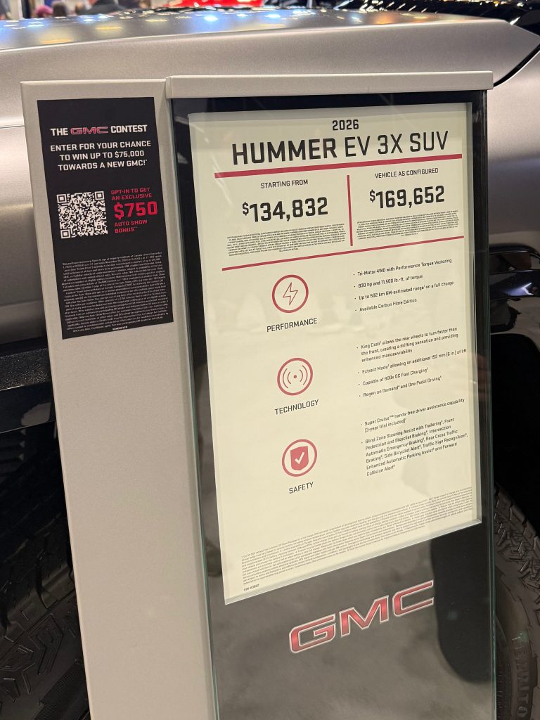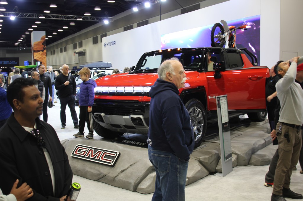 Hardly anyone could name an improvement for people outside the vehicle – a Chevrolet rep mentioned “good bicycle stuff” and the GMC rep also touted the Hummer EV’s cyclist detection system. We didn’t get to see it for ourselves, but he explained that when a cyclist comes out of nowhere the side mirror alert would beep and light up to tell the driver. We did point out that it’s unlikely the cyclist would have come out of nowhere, and perhaps improved sightlines might help with this. Keep in mind that the Hummer EV weighs 9,000lbs, has a hood height of 122cm (48 inches), and can get from 0 to 100km/h in 2.8 seconds. The Hummer EV, as configured at the auto show, also costs $169,652, and while it was certainly on the pricey end, most vehicles we saw at the show cost at least $60,000. So much for being a bastion of the working class.
