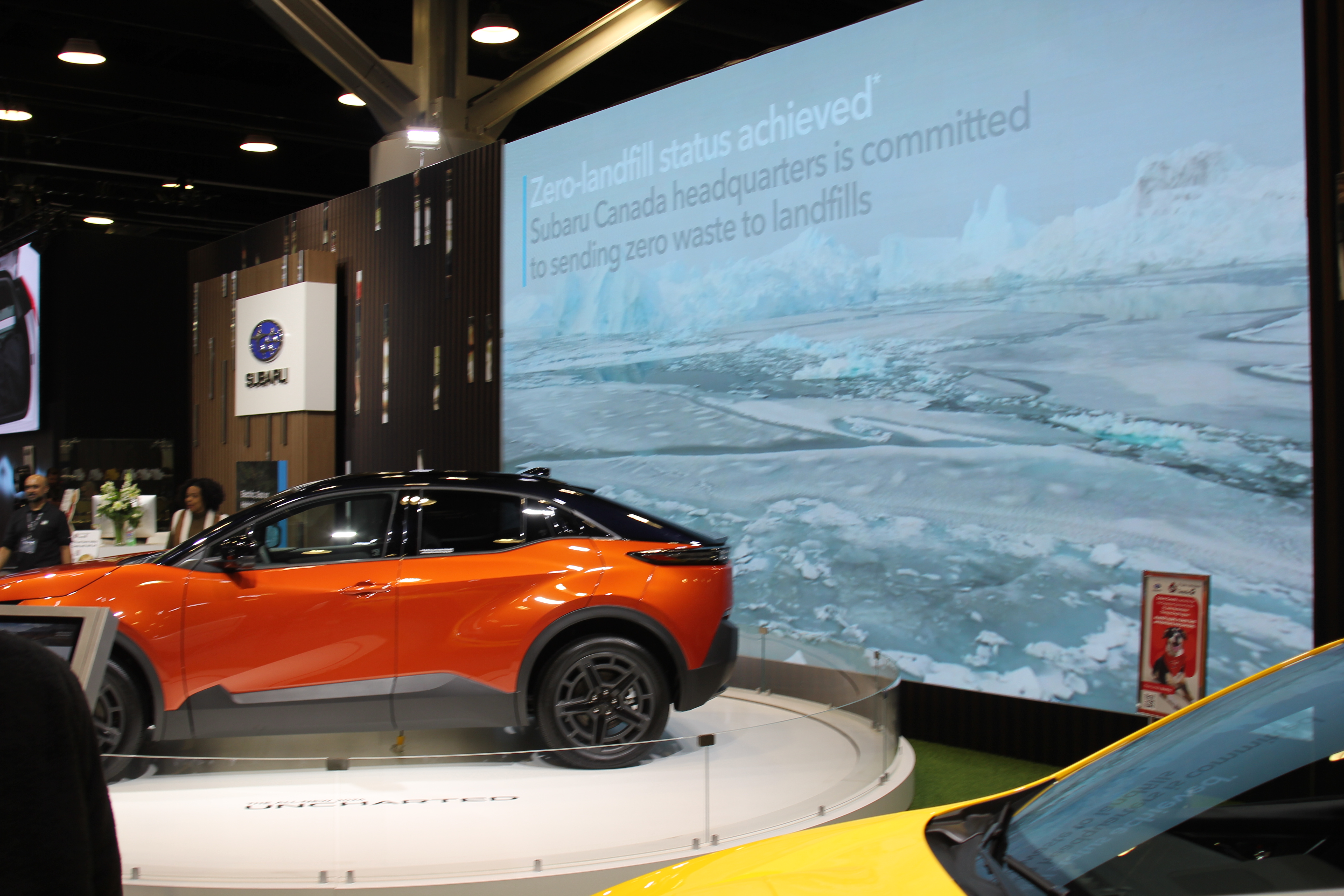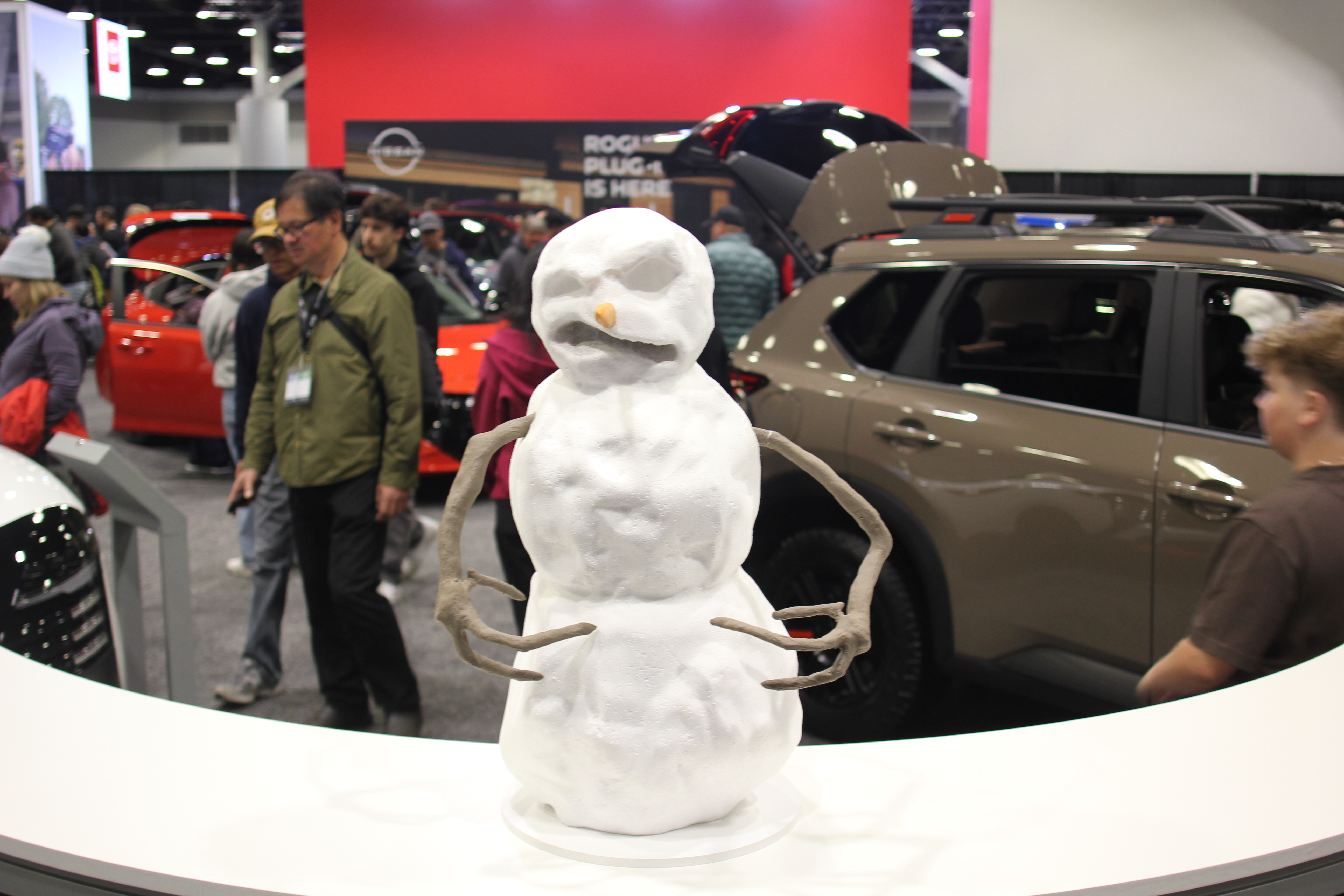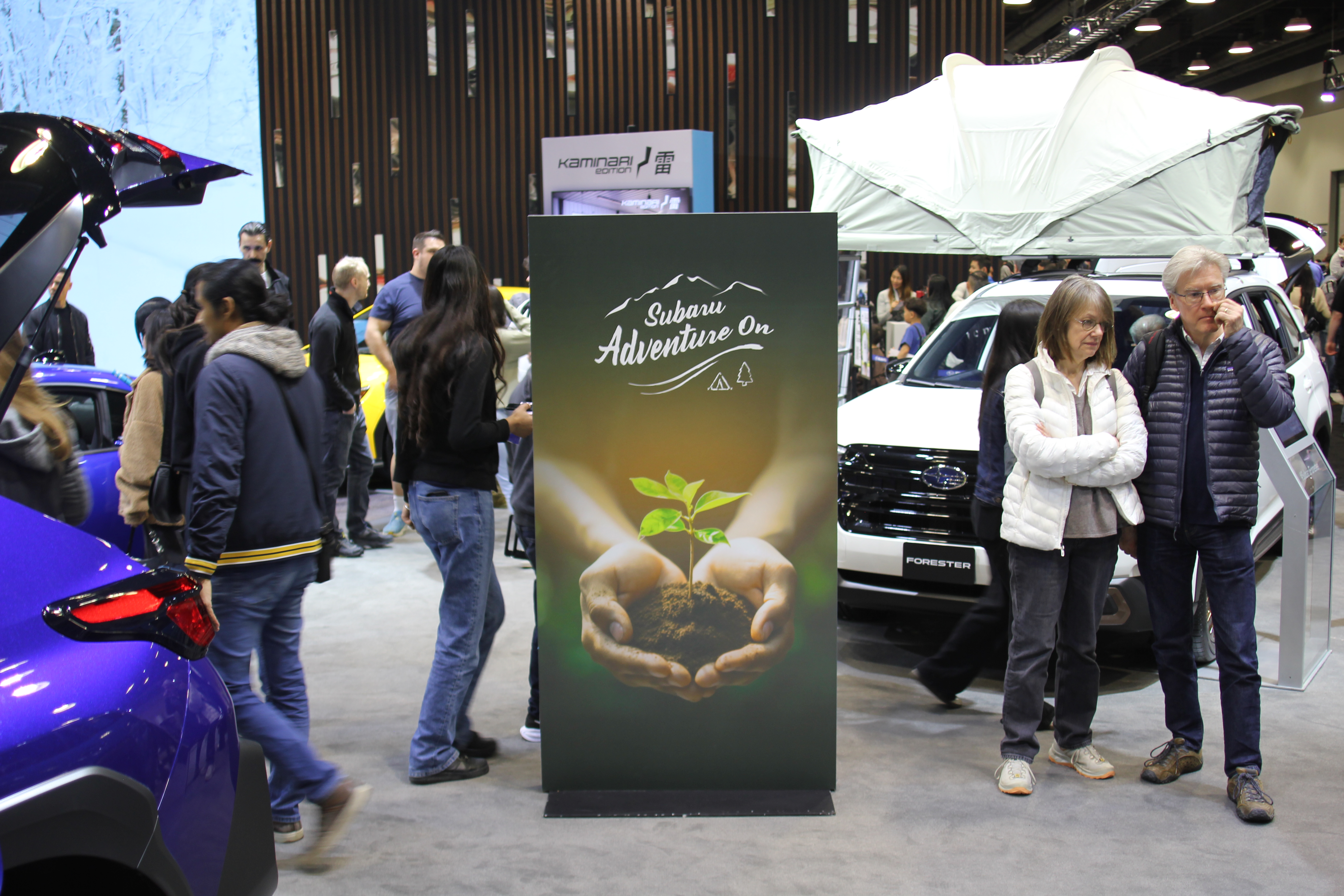 The first thing that immediately struck me on the show floor was how much nature marketing was present. Despite the fact that cars are a leading contributor to climate change1, mountain and desert imagery was everywhere. Subaru was offering free hats with outdoor-themed patches. ICBC’s astro-turf booth featured a camping gear giveaway. A fake tree with a decal encouraged you to explore all that BC has to offer on the province’s 719,000 kms of roads. Nissan’s booth featured a sad looking snowman, a nod to their ‘iconic’ past commercial about conquering winter, and Honda’s booth featured an immersive tunnel full of screens displaying cars driving through nature scenes.